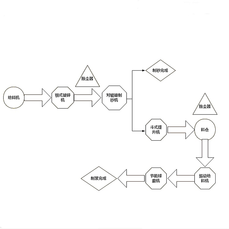 煤矸石的硬度不算太高,在使用它進(jìn)行制砂時可以選擇對輥破、顎破、反擊破等組合使用,當(dāng)然還需要配備一些輔助設(shè)備。近日來自山東泰安的李總需要購買煤矸石制砂制漿設(shè)備聯(lián)系到我們,根據(jù)他的需求我們?yōu)樗O(shè)計了方案。我們了解到李總的煤矸石原料為200mm,經(jīng)過具體分析,需要使用到的設(shè)備有給料倉、對輥制砂機(jī)、斗式提升機(jī)、料倉、振動給料機(jī)、節(jié)能球磨機(jī)各一臺,顎式破碎設(shè)備和除塵器各兩臺,具體工藝流程如下:
